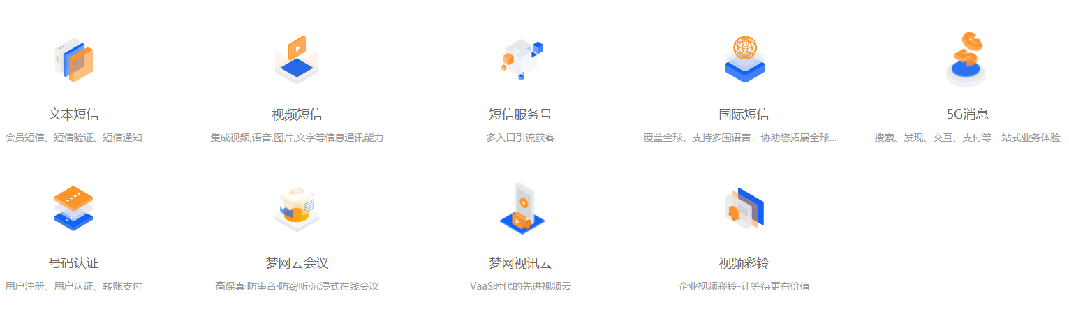 除文本短信外,凯发K8科技已开发并良好运营着包括视频短信、短信服务号、国际短信、5G消息、号码认证、凯发K8视讯云等多种云通信产品。