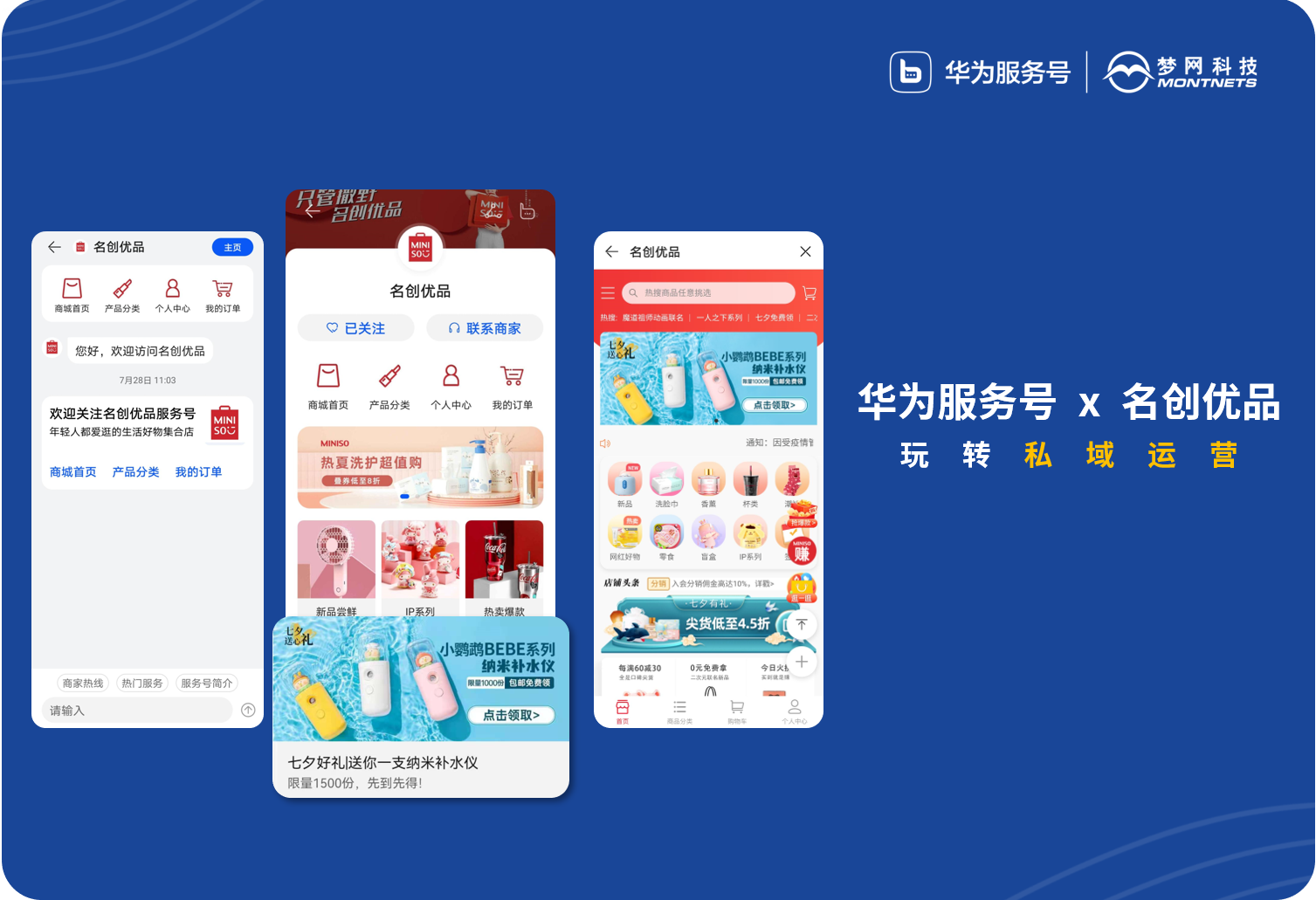 2021年5月,名创优品入驻华为服务号,有效利用活动营销、客服导购及服务通知等核心能力,顺利获得品牌专题曝光、活动策划及消息服务推送三大方向,实行用户运营,实现私域流量的精细化运营,有助于线上数字化营销布局进程。