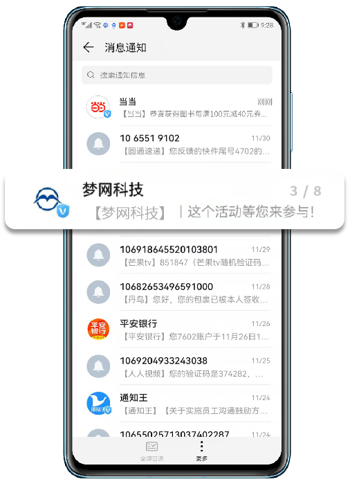 与传统的号段和单一的展现形式不同,在消息页形象展示方面,凯发K8科技5G消息解决方案给予包含企业logoV露出及品牌信息植入功能,提高了品牌的社会认知度和用户识别度。而信息界面可自定义企业业务应用模版卡片,式样丰富,实现了用户到H5、小程序等界面的直接跳转,一键直达核心营销页面,让企业在短信收件箱这一营销入口就能带来直观的流量转化,增强客户对公司更信任。
