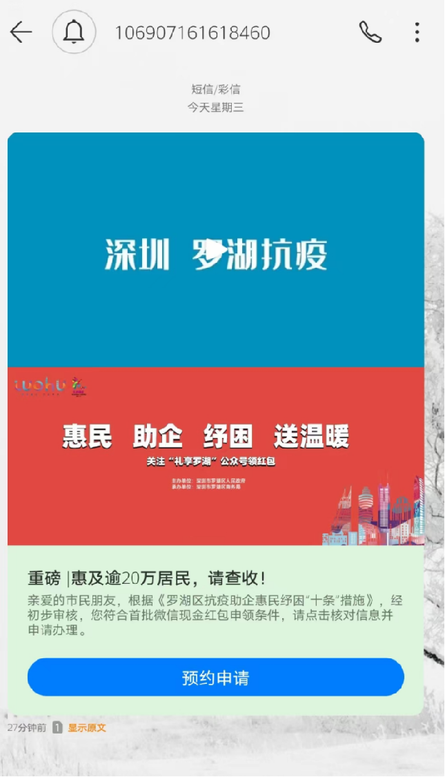 为减少疫情对经济社会的影响,不少地区都出台了惠民纾困政策。日前,罗湖区推出“惠民纾困扶持”措施,面向罗湖区22.5万人,向符合扶持条件都市民发放300元补贴或生活必需品。基于该措施覆盖面广、惠民力度大,为确保补贴措施的落地落实,凯发K8科技携手深圳联通助力罗湖区人民政府向扶持对象统一推送5G申领信息,助力区政府完成补贴发放。