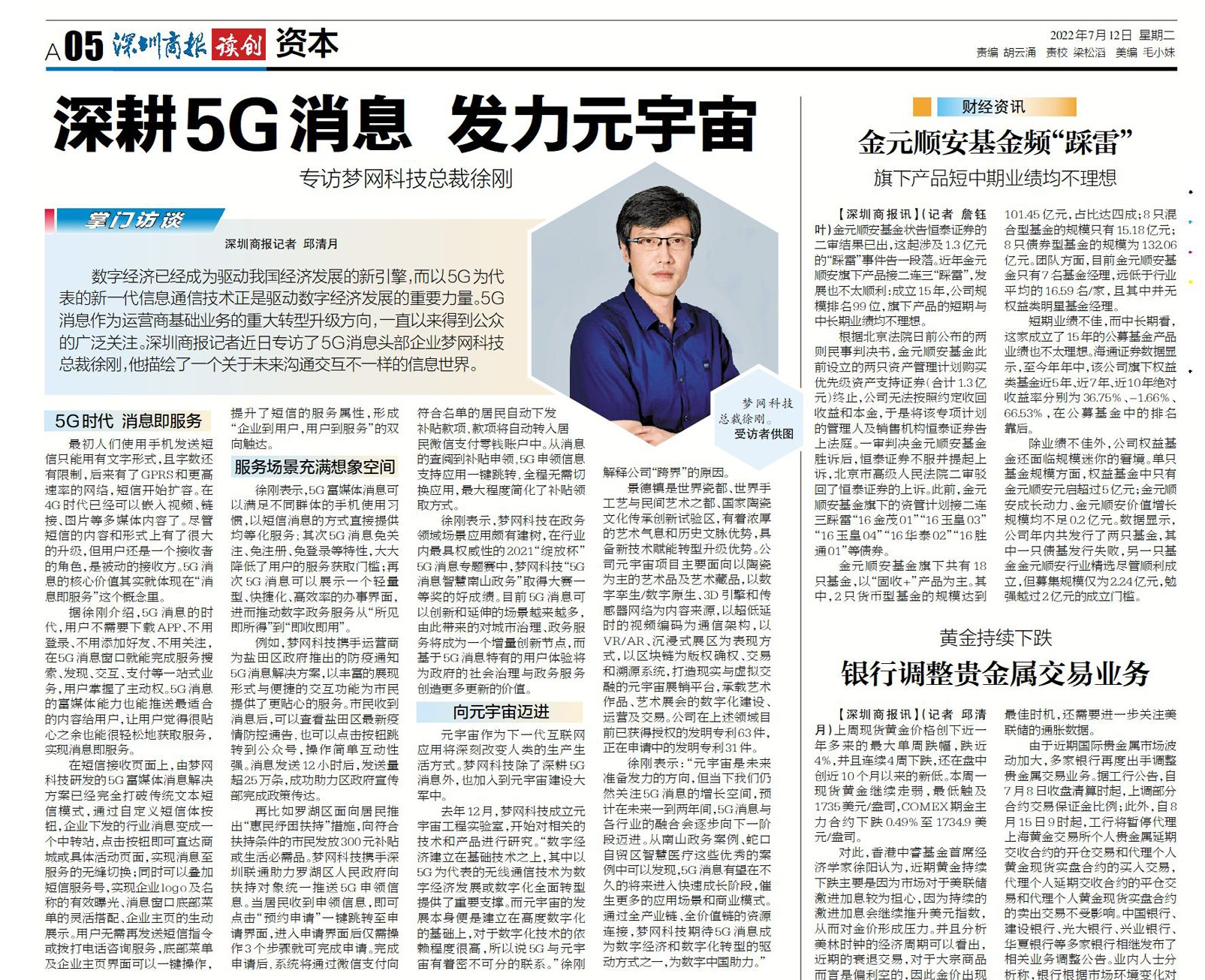 数字经济已经成为驱动我国经济开展的新引擎,而以5G为代表的新一代信息通信技术正是驱动数字经济开展的重要力量。5G消息作为运营商基础业务的重大转型升级的方向,不断以来得到公众的广泛关注。深圳商报记者近期专访了5G消息头部企业凯发K8科技(002123)总裁徐刚,他描绘出了一个关于未来沟通交互不一样的信息世界。